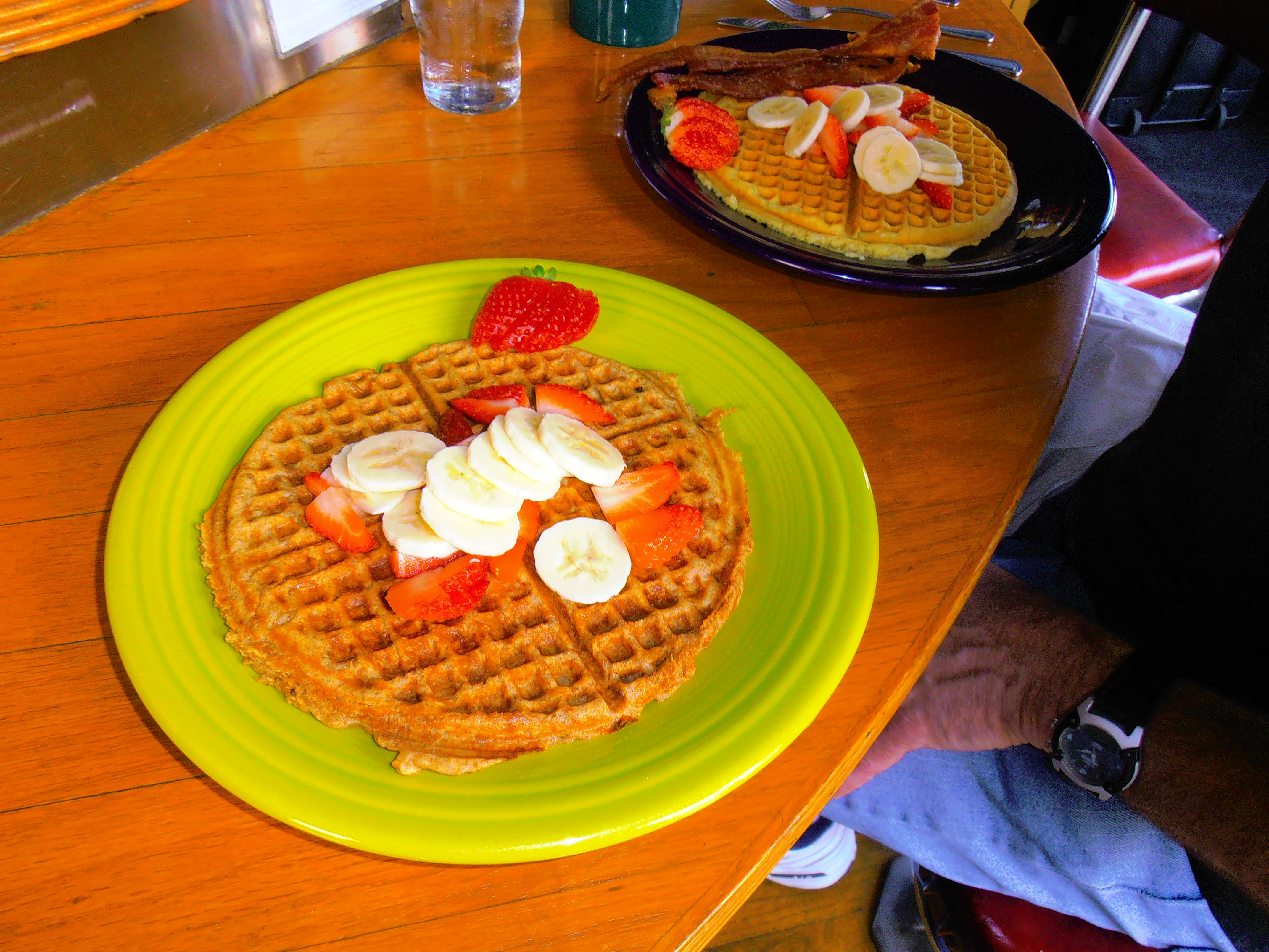 Monday we both thought was the most fun of the whole trip. We set out straight away for the Seattle to Bainbridge ferry from the Ferry Terminal. We drove on our car and took in the city as we departed on the 30 minute ferry. Once we arrived at Bainbridge and toured the island for a bit we got brunch at a cute and colorful little place called the Streamliner Diner just a hop, skip and a jump away from the Bainbridge ferry terminal. We both chose the strawberry and banana waffles, Dad sticking with the classic diner style and me venturing out to try their gloriously nutty and hearty whole wheat n’ flax waffle. I really enjoyed my waffle and I think Dad enjoyed his as well as eggs, bacon and a biscuit he saved for an afternoon snack. We strolled around Winslow Street window shopping and browsing the cute stores. After some time we went to the Bainbridge High School to hit some tennis balls. After some time playing tennis we headed back to the ferry to come back to the mainland.