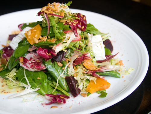 Chioggia Beet & Goat Cheese Salad, Mixed Baby Greens, White Balsamic, Laura Chanel Goat Cheese, Oregon Hazelnuts