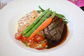 Olympic Duo, Grilled Pacific NW King Salmon with Kalamata Olive Salsa Fresca & Petite Filet, Whipped Yukon Gold Potato, Roasted Spaghetti Squash, King Oyster Mushroom Demi Glace